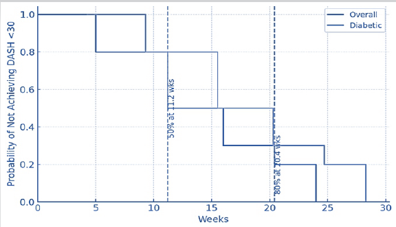 A Kaplan–Meier analysis demonstrated that the median time to achieve a DASH score <30 was 11.2 weeks. Patients with T2DM required 4.3 weeks longer to reach the same functional milestones compared to non-diabetics (log-rank P = 0.03) (Graph 1).