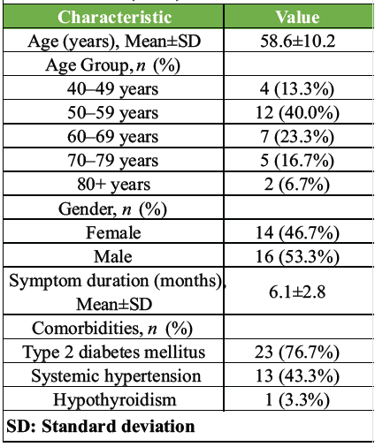 A total of 30 patients were included in the study. The cohort had a mean age of 58.6 ± 10.2 years, with the largest proportion of patients (40.0%) belonging to the 50–59 age group. The gender distribution was relatively balanced, with a slight male predominance (53.3%). The average duration of symptoms before treatment was 6.1 ± 2.8 months. Comorbidities were common, with a high prevalence of type 2 diabetes mellitus ([T2DM], 76.7%) and systemic hypertension ([SHTN], 43.3%). The complete baseline characteristics are summarized in Table 1.
