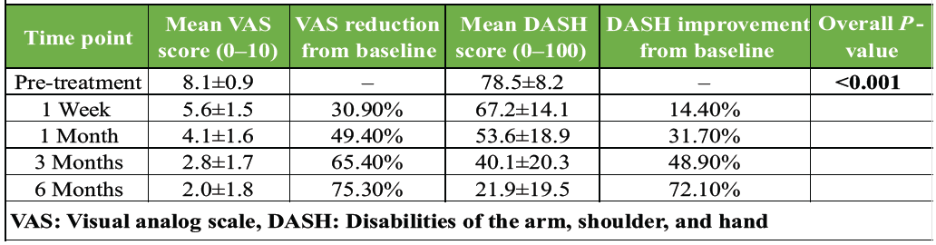 Functional improvement, as measured by the DASH questionnaire, mirrored the pain reduction. The mean DASH score improved from 78.5 ± 8.2 at baseline to 21.9 ± 19.5 at 6 months, a 72.1% improvement (P < 0.001). By the 6-month endpoint, 80% of patients (24/30) achieved a DASH score of <30, indicating a return to near-normal shoulder function. The longitudinal results for both VAS and DASH scores are presented together in Table 2.