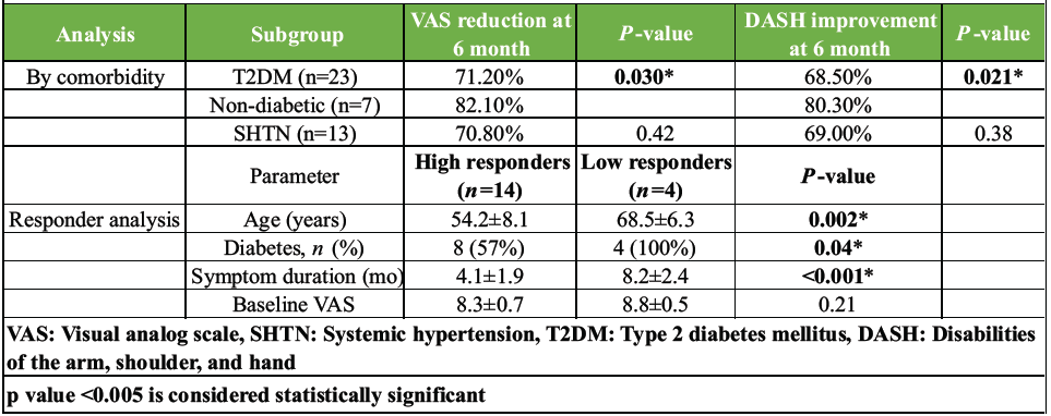 Findings: After 6 months, there was a 75.3% reduction in pain scores and a 72.1% improvement in functional scores. Patients who were younger, non-diabetic, or had symptoms for <6 months experienced more favorable outcomes. Multivariate analysis confirmed age, diabetes, and symptom duration as significant outcome predictors.