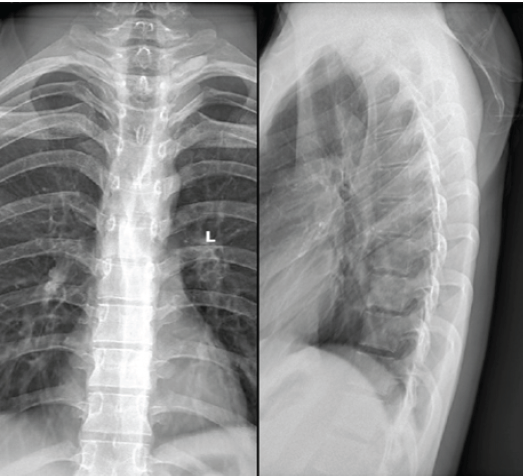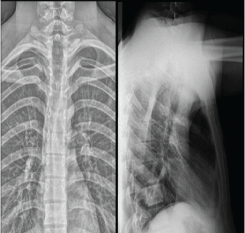 Figure 1: Pre-operative radiographs (anteroposterior and lateral views) of the dorsal spine showing irregularity and loss of cortical definition at the D1–D2 vertebral levels with mild anterior height reduction of D2, suggestive of a destructive vertebral lesion.