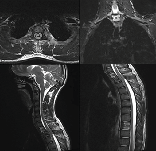 Figure 2: Pre-operative magnetic resonance imaging of the dorsal spine showing altered marrow signal and enhancing lesion involving the D1–D2 vertebral bodies with an epidural soft-tissue component causing severe spinal canal narrowing and cord compression with associated myelopathic signal changes. Additional axial and sagittal sequences demonstrate the extent of epidural involvement and compression.