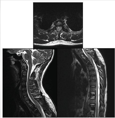 Systemic examination of cardiovascular, respiratory, and abdominal systems did not reveal any abnormalities. There was no palpable mass or lymph node enlargement. Based on the acute onset paraplegia with bladder involvement, an upper dorsal compressive myelopathy was suspected, and urgent imaging was advised.