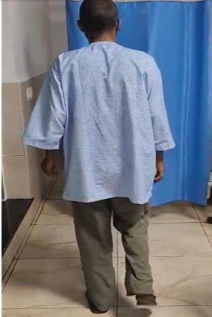 Figure 5: Post-operative clinical photograph showing the patient ambulant and walking independently 6 weeks after decompression surgery, demonstrating significant neurological recovery and functional improvement.