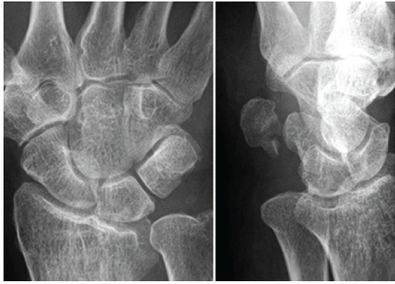 Figure 1: Initial plain radiographs demonstrate an isolated displaced intra-articular pisiform fracture with pisotriquetral joint incongruity.