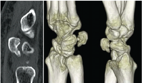 Figure 2: Computed tomography displays a small proximal fragment (3.7 mm) comminution, and pisotriquetral joint incongruity characterized by a cortical gap and a set-off.