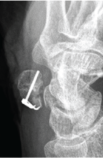 This construct provided stable fixation with interfragmentary compression, eliminating the need for direct fixation of the proximal fragment. The wound was closed in layers. Postoperatively, a volar forearm splint was applied with the wrist in a neutral position and maintained for 3 weeks.