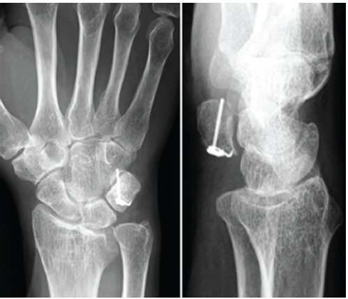 Figure 4: Radiographs at the 12-month follow-up demonstrate bone union with proper anatomical alignment and no pisotriquetral degenerative changes.