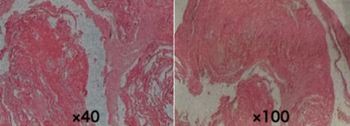 Histological examination demonstrated a fibrinous mass with infarction and necrotic fibrous tissue, surrounded by fibrocollagenous tissue (Fig. 6), findings consistent with a foreign body reaction. The post-operative course was uneventful, symptoms resolved within 1 month, and the patient returned fully to his construction work within 2 months.