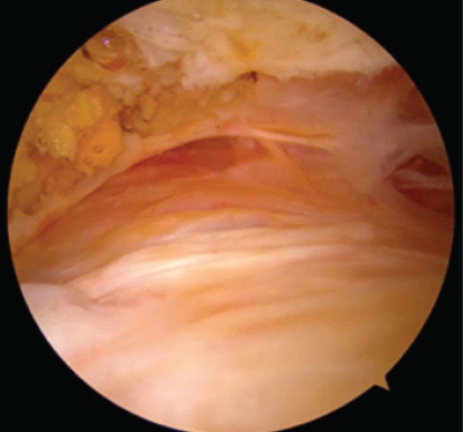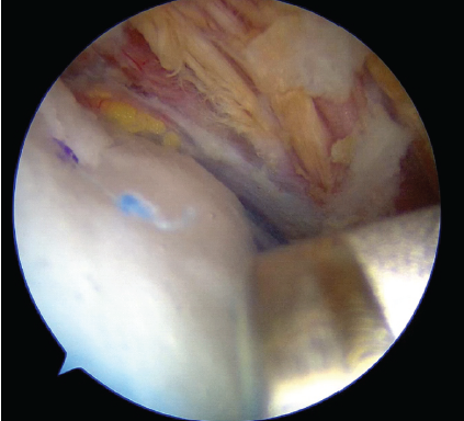 Figure 5: Post-excision arthroscopic view of healed rotator cuff. Arthroscopic image of the right supraspinatus tendon after removal of the loose body, showing complete tendon healing and intact repair site.
