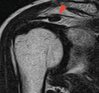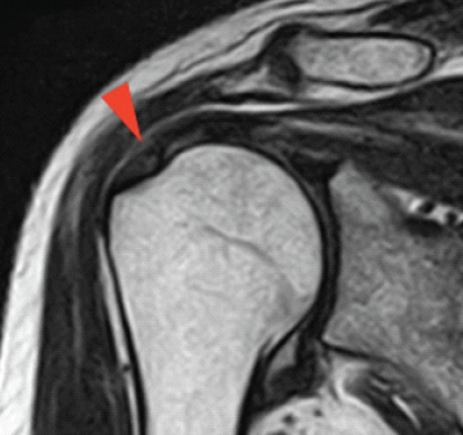 Figure 1: Pre-operative coronal T2-weighted magnetic resonance imaging (MRI) showing partial-thickness supraspinatus tear. Pre-operative coronal T2-weighted MRI of the right shoulder demonstrating a partial-thickness tear of the supraspinatus tendon (arrowhead). The image was obtained before any intervention.