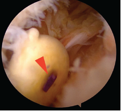 Figure 4: Arthroscopic removal of loose body containing medial staple. Arthroscopic image of the excised loose body measuring approximately 16 × 13 mm, with the medial staple (arrowhead) of the REGENETEN® implant embedded at its center, surrounded by fibrinous tissue.