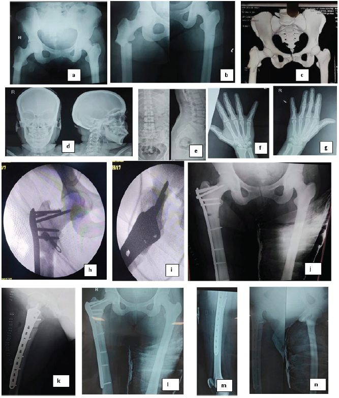 Figure 1: Case I. (a and b) X-ray showing subtrochanteric fractures. The right femur demonstrates a complete fracture, while the left femur shows a unicortical fracture with Pelvic bones showing increased bone density characteristic of osteopetrosis, (c) 3D computed tomography of the hips and pelvis showing increased bone density and fracture sites. (d) X-ray skull showing thickened and dense skull bones, (e) X-ray spine showing bone within bone appearance, (f and g) X-ray hand showing increased bone density and loss of corticomedullary differentiation, (h) intraoperative fluorescent images of the fixation of fracture with plate, (i and j) postoperative X-ray of the fixation showing good alignment and fixation, (k-n) 2 months post-operative X-ray showing signs of union at both right and left side.