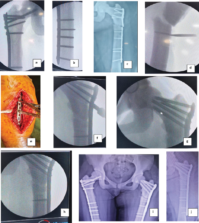 Figure 2: Case II. (a and b) Old united subtrochanteric fracture right side fixed with plate, (c) fracture subtrochanteric femur left side with broken proximal humerus interlocking plate osteosynthesis system plate in situ, (d) intraoperative fluorescent imaging showing while removing implant screw head breakage was encountered, (e) Intraoperative positioning (lateral decubitus) and plate placement, (f-h) Intraoperative fluorescent imaging showing proximal femoral anatomical locking plate fixation, (i) Post-operative picture – right sided united fracture subtrochanteric femur with distal femur locking plate in situ and fixed fracture subtrochanteric femur with proximal femoral anatomical locking plate in situ showing good reduction and alignment, (j) Post-operative picture of plate fixation.