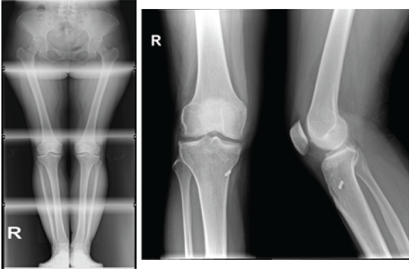 The patient was a 39-year-old woman who presented with right knee pain. She had undergone a subtotal lateral meniscectomy when she was 10 years old. For a while, she was able to exercise without any symptoms; however, she started to experience pain on the lateral side of the knee with swelling 6 years before. Physical examination revealed swelling and tenderness of the lateral knee joint. The range of motion (ROM) of her knee joint was 0°–120°. An X-ray with the Rosenberg view (standing posteroanterior view with 45° knee flexion) and a magnetic resonance imaging (MRI) revealed acceptable cartilage defects in the lateral compartment and residual lateral meniscus with degenerative changes and small loose bodies.