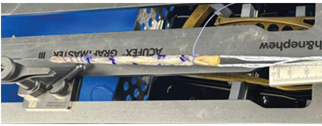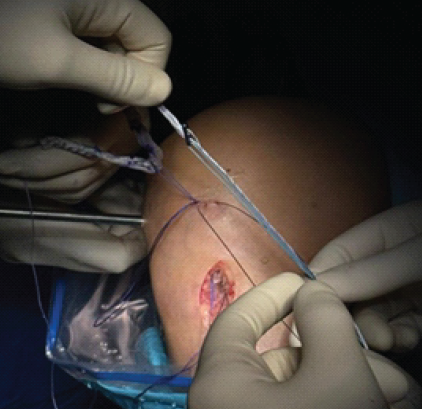 The proximal flat portion of the tendon was folded over the distal rounded portion to form a double-stranded loop. This folded segment was secured using a continuous 2-0 Vicryl suture, while both free ends were prepared with whipstitch sutures. A reference mark was made 25 mm from the posterior end of the graft using a sterile dermographic marker to guide the positioning of the posterior meniscal root within the tibial tunnel, ensuring adequate intraosseous integration (Fig. 2). In addition, a central suture was placed along the remaining portion of the graft using a no. 2 high-strength suture to assist with graft manipulation and positioning during implantation (Fig. 3).