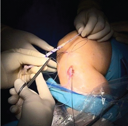 Anatomical anterior and posterior root tunnels were created using a meniscus root guide and an inside-out reamer, with diameters matched to the graft (6 mm) and a minimum inter-tunnel distance of 1.5–2 cm on the tibial surface to avoid convergence. The prepared graft measured 14 cm in length. It was introduced into the joint through the anteromedial portal, with the folded posterior end first guided into the posterior root tunnel (Fig. 4).