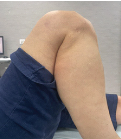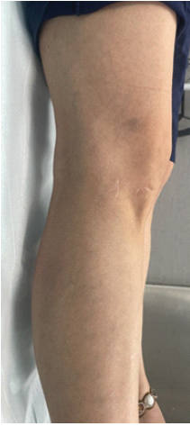 At the 1-month follow-up, the patient demonstrated knee flexion up to 60°, in accordance with the post-operative protocol, and reported only mild pain at full extension. Clinical inspection revealed well-healed incisions without inflammatory changes or signs of local infection (Fig. 5). The patient reported no episodes of instability, and the knee was stable on examination, with a negative Lachman test and no laxity under varus or valgus stress at both 0° and 30°.