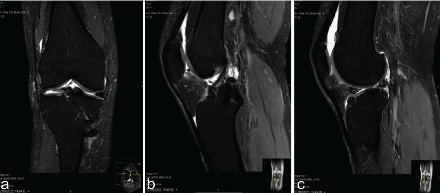 Figure 7: Magnetic resonance imaging T2 sequences. (a) Coronal section showing the anterior root of the external meniscus graft (left arrow) and the anterior tibial tunnel (right arrow). (b) Sagittal section showing the posterior root of external meniscus graft (upper arrow) and the posterior tibial tunnel (lower arrow). (c) Sagittal section showing the anterior and posterior roots of external meniscus grafts.
