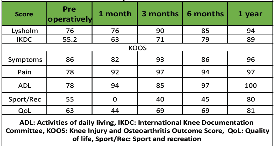 Functional outcomes (Table 1) also showed significant improvement: The Lysholm score increased from 76 preoperatively to 94, the International Knee Documentation Committee score improved from 55.2 to 89, and the Knee Injury and OA Outcome Score (KOOS) increased in the five dimensions (KOOS symptoms from 86 to 96, KOOS pain from 78 to 97, KOOS activities of daily living from 78 to 100, KOOS Sport/Rec from 55 to 80, KOOS QoL from 63 to 81).