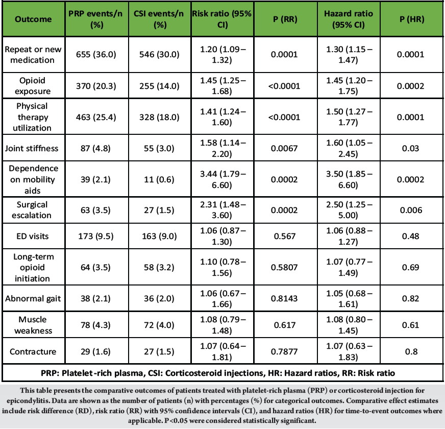 This large, multi-institutional, propensity-matched analysis provides real-world insight into short-term outcomes of PRP versus CSI for epicondylitis, incorporating opioid exposure, PT use, and surgical escalation endpoints often underreported in clinical trials.