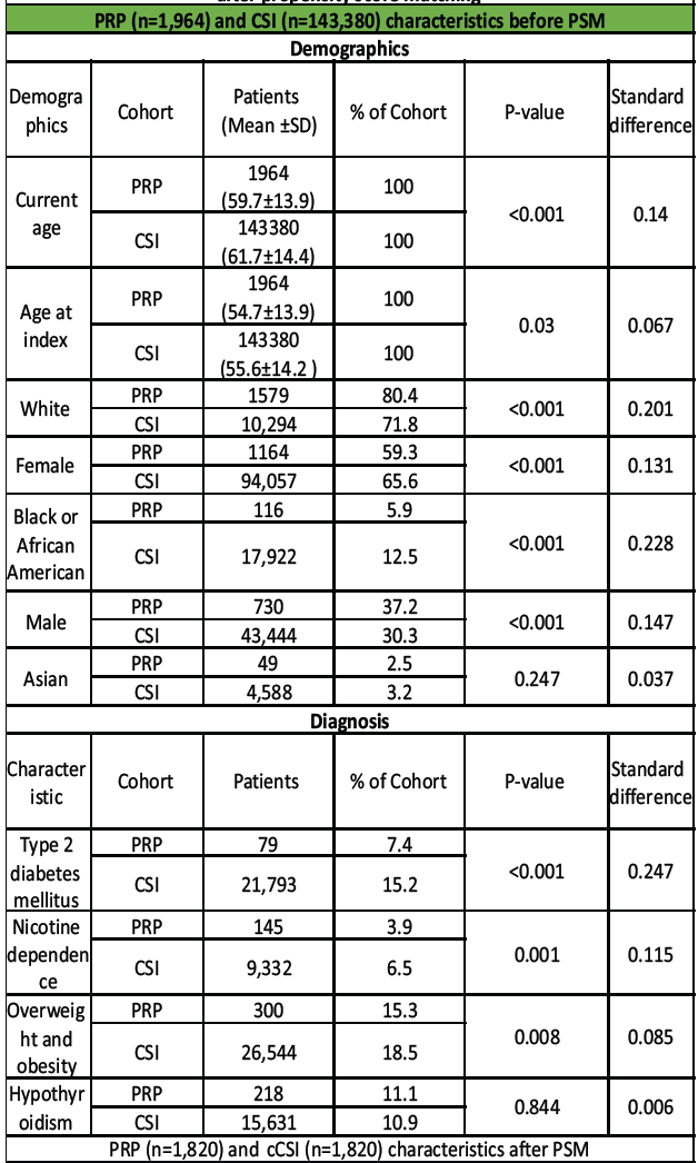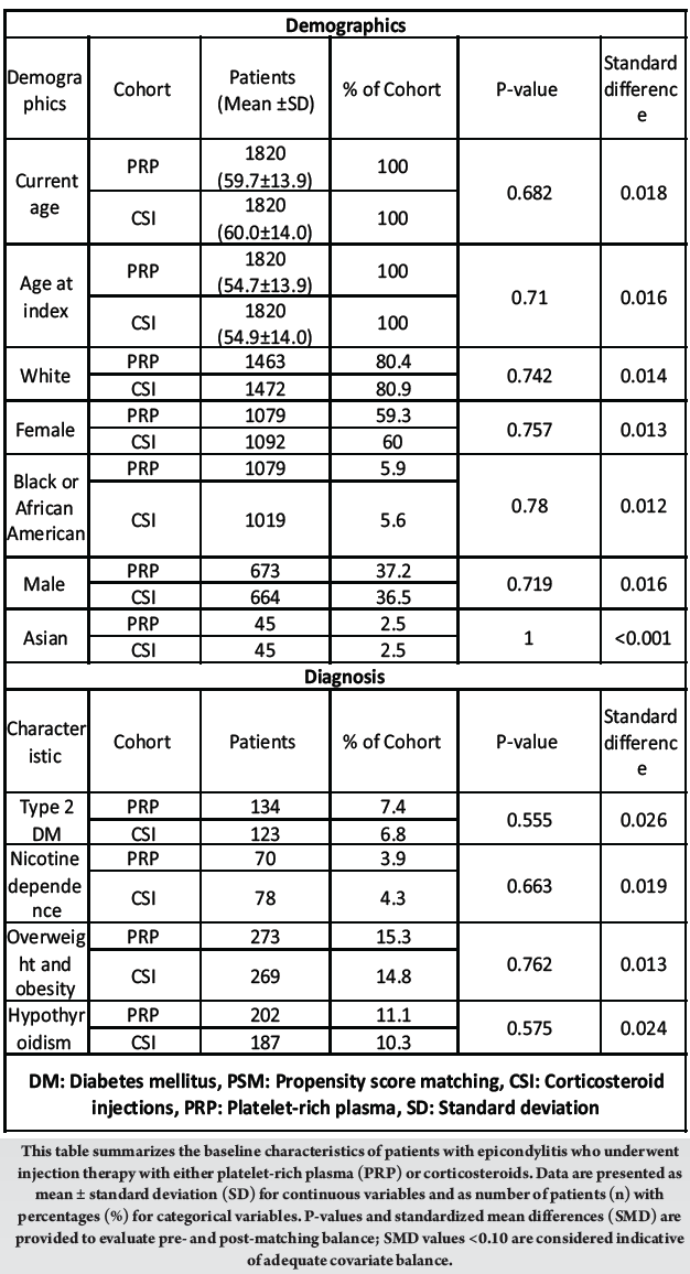 Table 1: Baseline demographic and clinical characteristics of patients receiving platelet-rich plasma versus corticosteroid injection for epicondylitis before and after propensity score matching