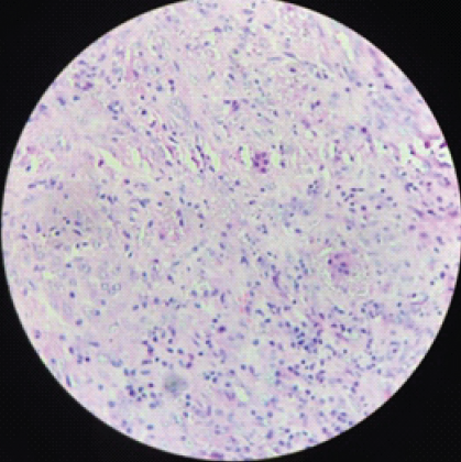 Figure 6: H&E section ×40:- Fibrocollagenous tissue showing mixed inflammatory cells and plenty of histiocytes with organism in their cytoplasm and new foreign body giant cells.