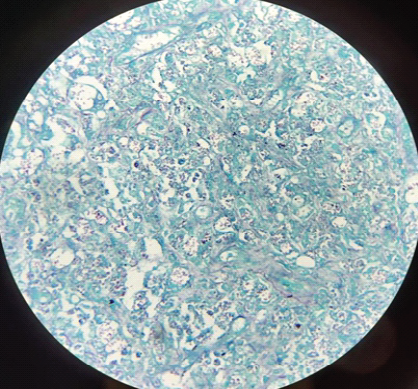 Figure 8: Special stain for confirmation, Gomori Methenamine Silvers (GMS) stain, ×40 GMS + for fungal organism.