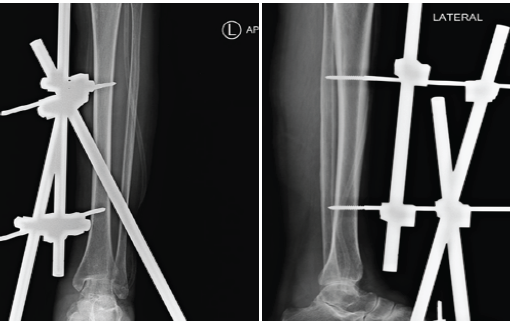 Thorough debridement of the infected tissue was done with a curette, till fresh bleeding was noted. Autologous bone graft was given and temporary stabilization with an external fixator was given. The patient was started on Amphotericin B for 6 weeks. Patient was advised non-weight-bearing walking (walker-assisted) for 3 weeks. (Fig. 9).