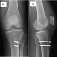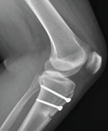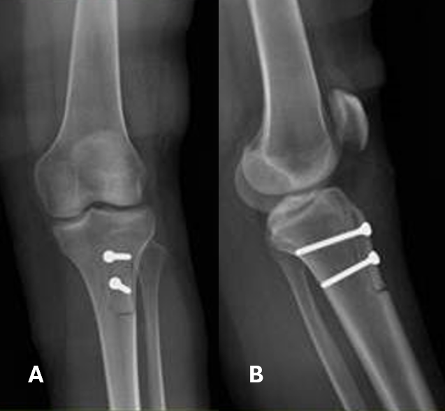 Figure 1: (a) Anteroposterior and (b) lateral view of the left tibia immediately after tibial tuberosity osteotomy fixed with 4.5 screws.
