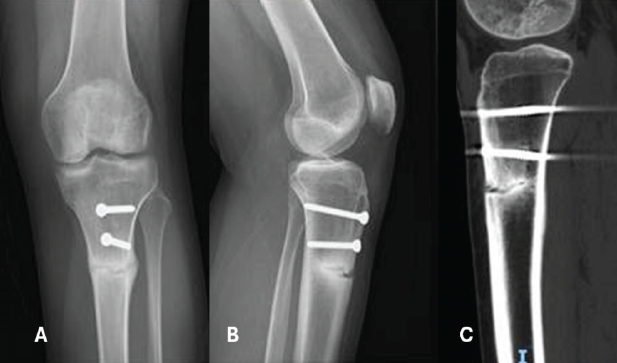 Figure 3: Anteroposterior view (a), lateral view (b), and sagittal computed tomography image (c) demonstrate the critical progression of the fracture line, involving two-thirds of the entire tibial diameter.
