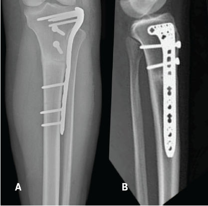 Figure 4: Anteroposterior view (a), lateral view (b) demonstrate the immediate post-surgical view of fracture fixation with lateral tibial pre-modulated locking plate.
