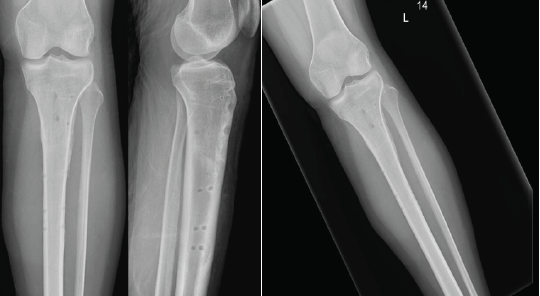 Figure 6: Anteroposterior view (a) and lateral view (b) demonstrate the post-removal tibia, showing a well-healed fracture site.