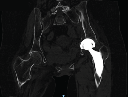 Radiographic evaluation, including computed tomography, revealed the protrusion of the acetabular cup into the pelvis, associated with a transverse acetabular fracture and a Vancouver AG-type fracture (Figs. 1 and 2).
