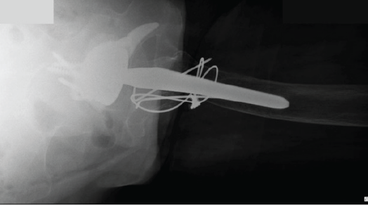 At 8 weeks postoperatively, the patient was pain-free, with a range of motion of 0–100° flexion, 30° abduction, 30° adduction, 30° internal rotation, and 30° external rotation. She had successfully resumed mobility, taking several steps with the assistance of a wheeled walker. At the 6-month follow-up, the patient reported walking and moving as she did before the trauma and surgery. Radiographic evaluation at that time confirmed implant stability and showed signs of bony consolidation of the greater trochanter (Figs. 3 and 4).