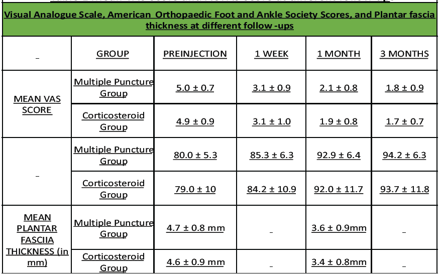Conclusion: Multiple puncture technique is a safe and effective modality of treatment for plantar fasciitis.