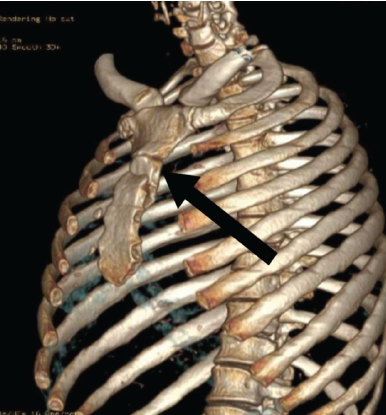 Figure 1: Computed tomography scan of the chest showing the displaced upper third of the body of sternum.