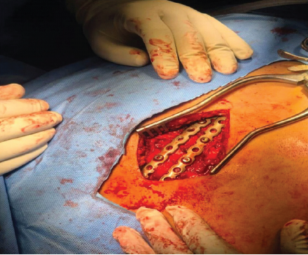 Figure 5: Railroad technique using prebent 2 low-profile 3.5 mm titanium locking plate fixation of transverse fracture of sternum.