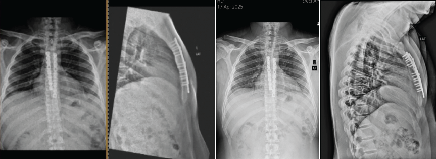The plates were initially secured with cortical screws, followed by locking screws bicortically, while ensuring that drilling was performed cautiously and checked under thoracoscopy to avoid irritation of underlying structure (Vid). Final reduction was deemed satisfactory and confirmed through fluoroscopy and thoracoscopy. The wound was closed in layers and stapled. The post-operative period was uneventful, and the patient was able to sit upright the following day. Sutures were removed on 12th postoperative day, and follow-up X-rays (Fig. 6) showed that the implants were in good position.