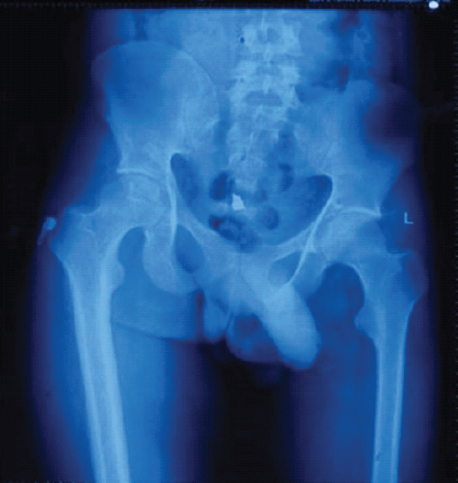 Figure 1: X-ray of bilateral hip with pelvis with femur to compare femoral width between poliotic (L) and non-poliotic limb (R).