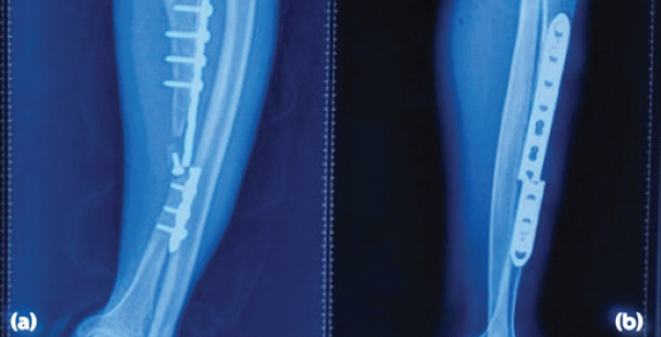 A non-union of the tibia with bone loss was observed, accompanied by a broken 4.5 mm narrow limited contact dynamic compression plate and multiple screw loosening (Fig. 2).