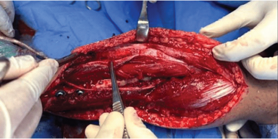 Step 1: Removal and tibial preparation: The prior anterolateral surgical incision (2 cm from the tibial crest) was utilized. Implants were removed, and the non-union margins of the proximal and distal tibial segments were freshened.
