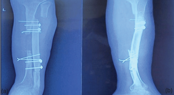 Figure 6: X-ray anteroposterior (a) and lateral (b) views after 6 months showing proximal tibio-fibular union (synostosis).