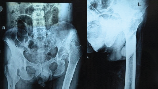 Patient followed for 1st month and 3rd month, having pre-operative Harris Hip score of 14.04% which has improved to Harris Hip score of 48.55 and 62.20, respectively.