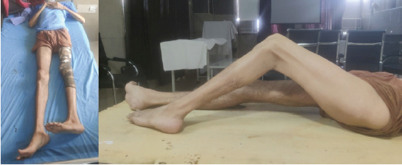 The patient went to different local centers and was managed conservatively. After 1½ year, he presented to our center. The limb had shortening of 7 cm with fixed flexion, adduction, and internal rotation deformity (Fig. 2). He was initially managed with skeletal traction application for 1 month, but to no avail. Surgery was planned, and the patient was investigated for the same.