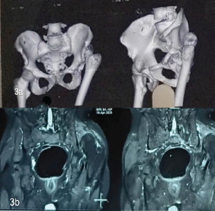 Figure 3: (a) Computed tomograph Images showing posterior superior dislocation of the left femoral head with the posterior column of left acetabulum appears fragmented; (b) Magnetic resonance imaging images showing complete loss of articular cartilage without any evidence of avascular changes in the femoral head.