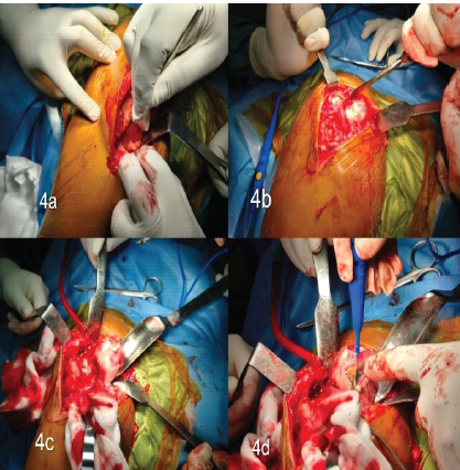 Figure 4: (a) Posterior(southern) approach used with incision given more posteriorly: (b) High riding greater trochanter and femoral head was identified (c) Intraoperative image showing chondrolysis of the femoral head, and thus total hip arthroplasty was planned intraoperatively; (d) Intraoperative image showing the release of the femoral head from surrounding soft tissue.