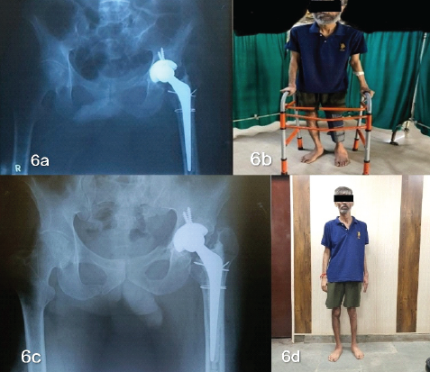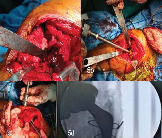 The femoral shaft was exposed for stem preparation. Initially, broaches for uncemented stems were used, but the femur was very osteoporotic, and the decision to put a cemented stem was taken. After broaching the canal, a trial was done after putting a small stem without a head to assess reducibility. Initially, even this was very difficult, and sustained traction was used to reduce the stem. Traction was continued for 10 min even after reduction, to gradually stretch the tissues. The knee joint was flexed to reduce sudden traction injury to the sciatic nerve. The trial stem and head were dislocated using a bone hook. Being a tight reduction, it was difficult to dislocate, and sustained traction with a bone hook was used to dislocate it. However, we encountered a medial calcar fracture on the anterior surface after removing the femoral stem. The fracture line extended nearly an inch below the calcar. Encerclage wires were used to prevent any further propagation of the fracture (Fig. 5c). The stem was then cemented using compression of the fracture with bone holding forceps. Extravasated cement was removed. No trial reduction was done to prevent any further fractures of the osteoporotic bone. Final reduction was done with a small-sized head, and the limb was put in flexion at the knee to prevent sciatic nerve injury, and then gradually straightened the leg (Fig. 5d).