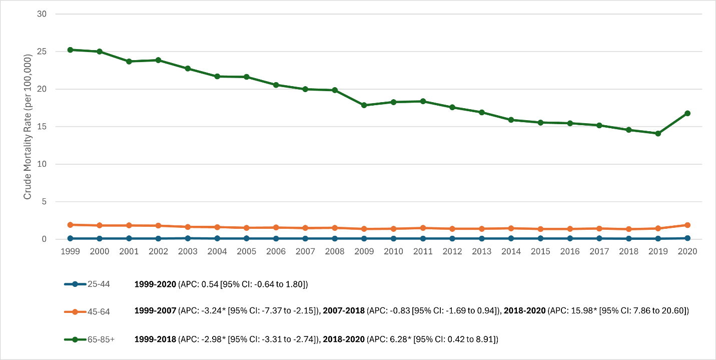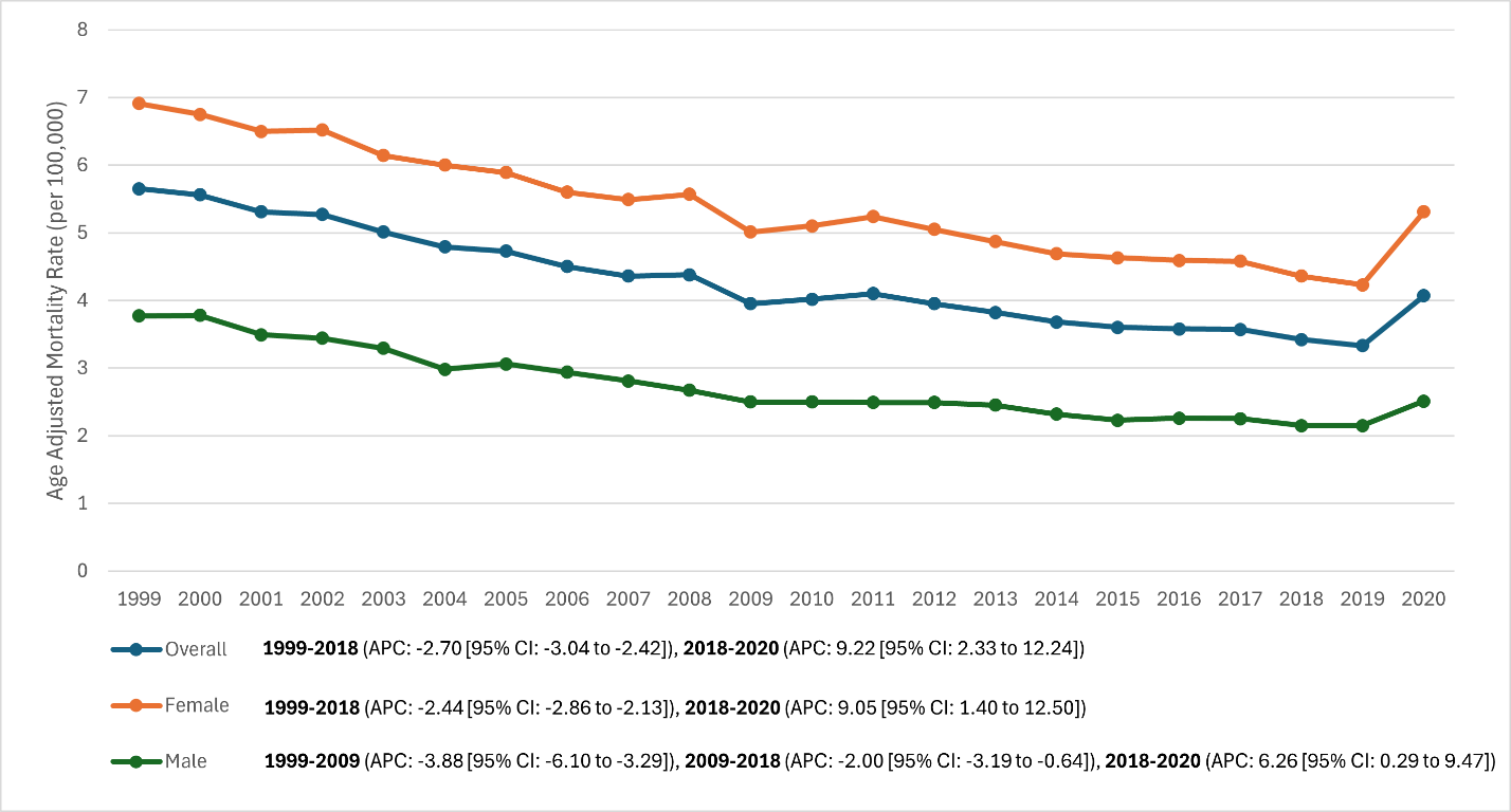 - Asian/Pacific Islander: Lowest mortality; 44 (1999) to ~1.2 (2017–2018) → 1.87 (2020). No joinpoint; continuous decline –2.36%/year (1999–2020; P < 0.001). The 2020 rise was modest relative to other groups.
