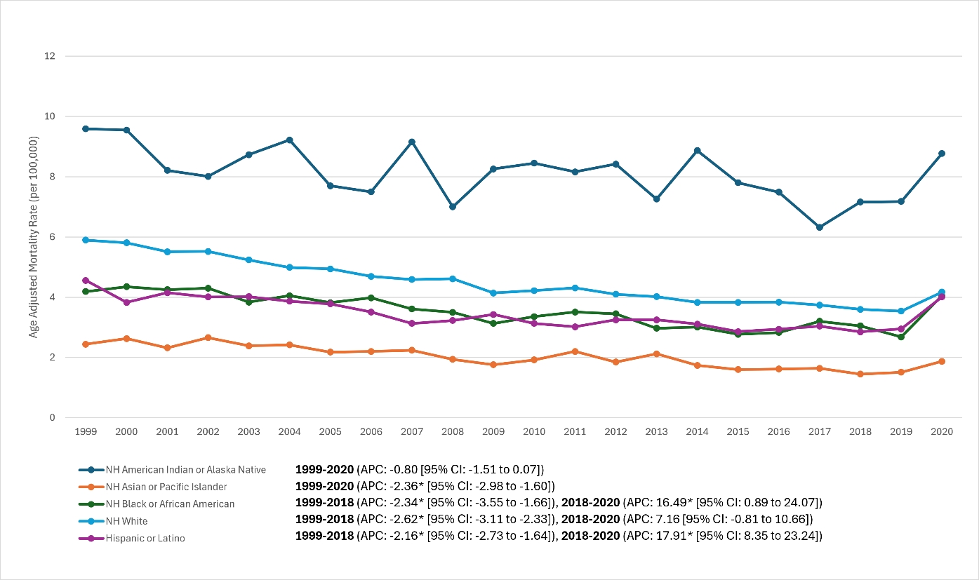 - Hispanic (any race): ~5 (1999) to ~2.5 (2015–2016), plateau ~2.2–2.4 (2018), then 4.01 (2020). Joinpoint: –2.16%/year (1999–2018; P < 0.001) then +17.91%/year (2018–2020; P < 0.001). Net AAPC –0.41% (P = 0.09); 2020 approximated White rates.